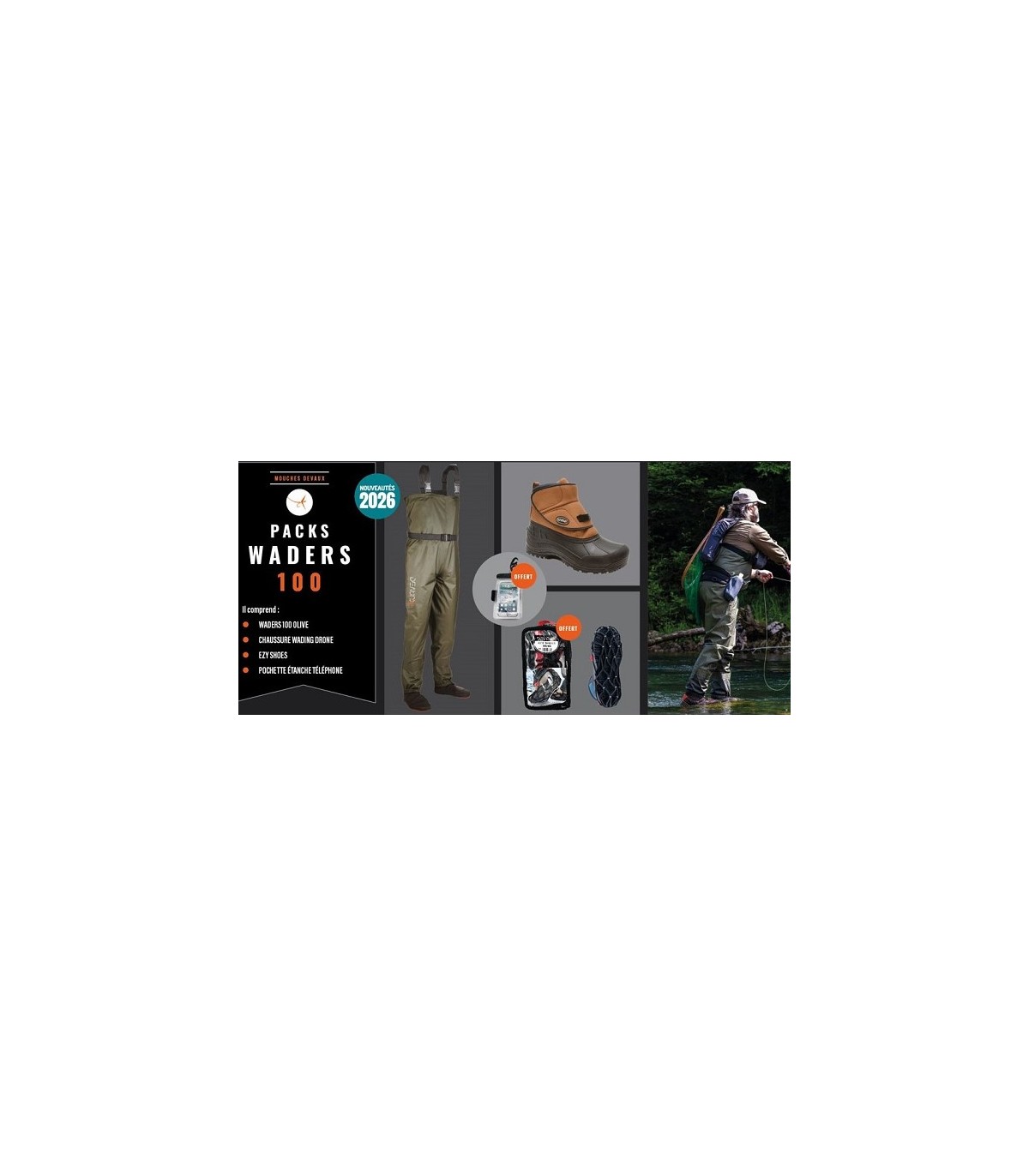 Pack Waders Devaux 100 : waders 100 olive, chaussures Drone, EZY Shoes et pochette étanche offerte. Un ensemble complet et fiable pour débuter la pêche en toute sécurité.